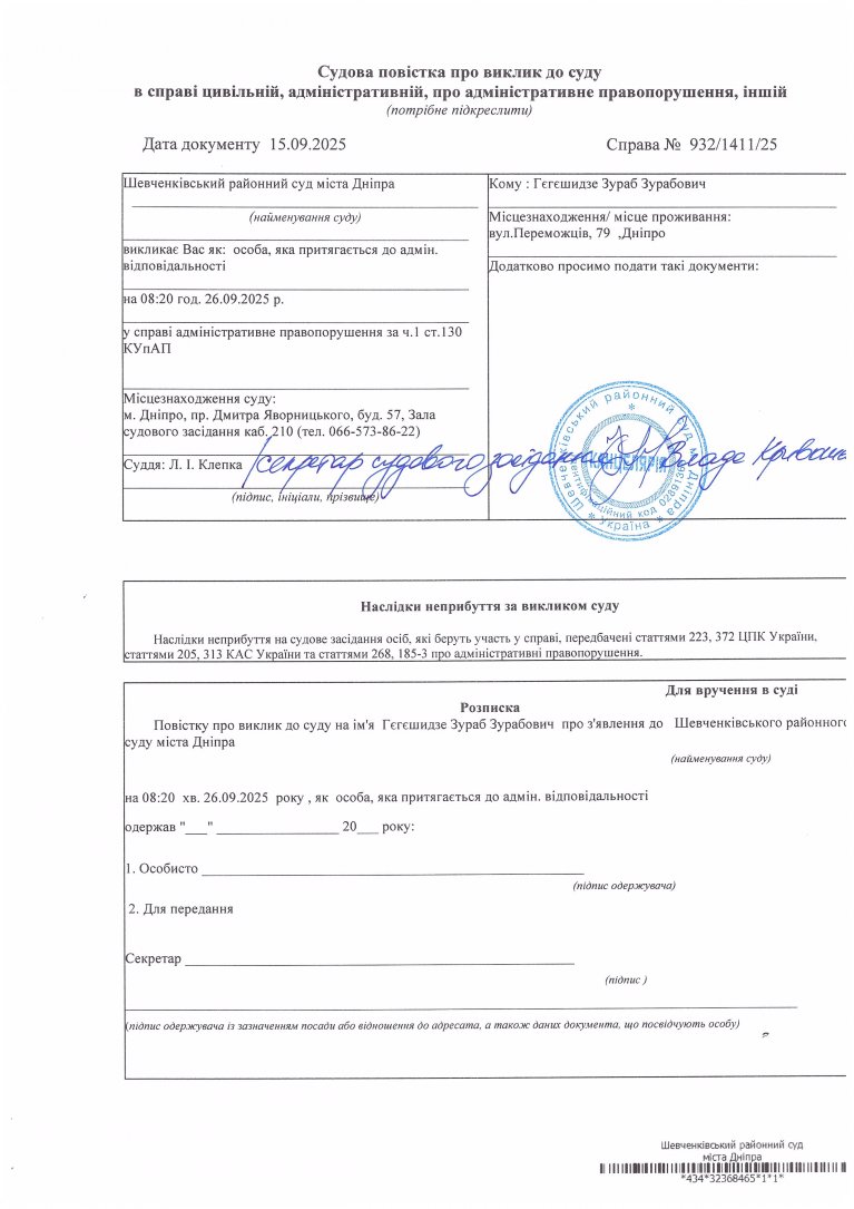 ОГОЛОШЕННЯ ПРО ВИКЛИК ДО СУДУ ГЄГЄШИДЗЕ ЗУРАБА ЗУРАБОВИЧА за ч.1 ст130 КУпАП на 26.09.2025 на 08 год. 20 хв.