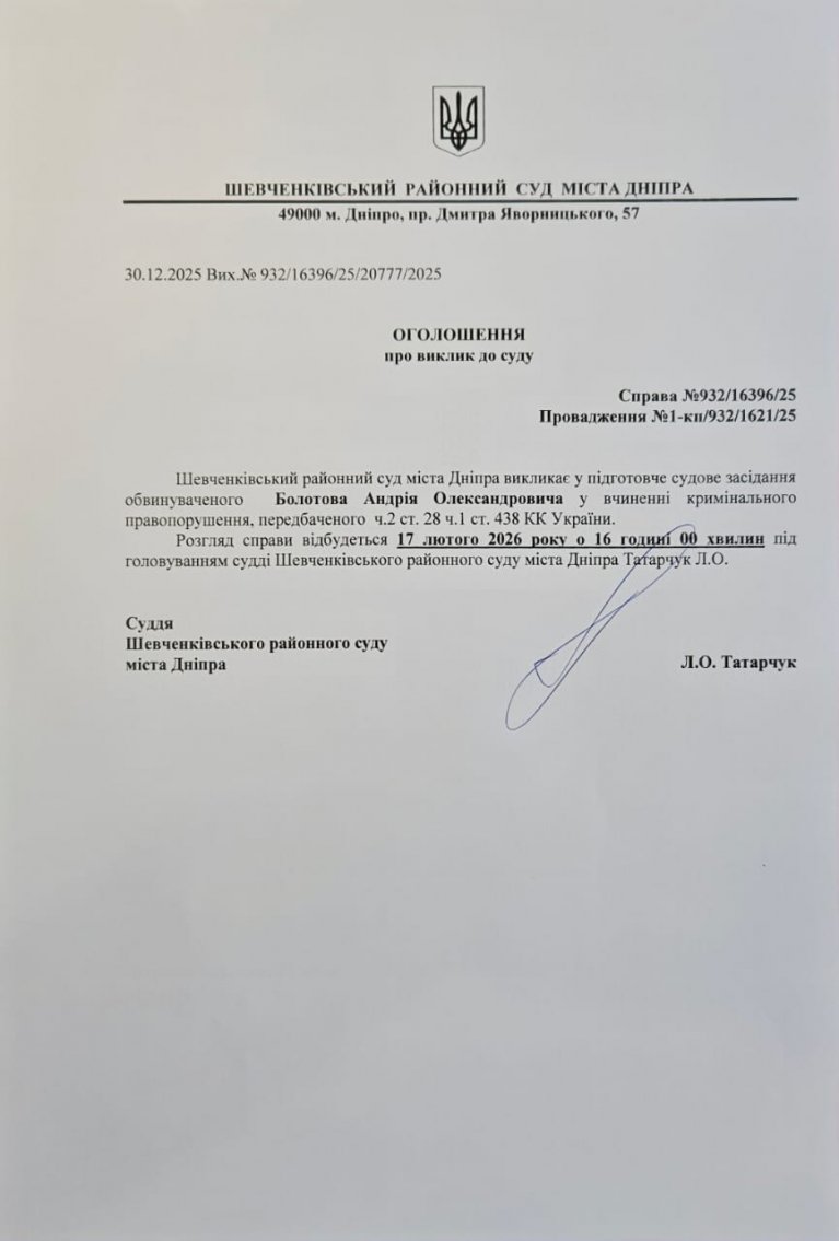 Оголошення про виклик до суду Болотова А.О.