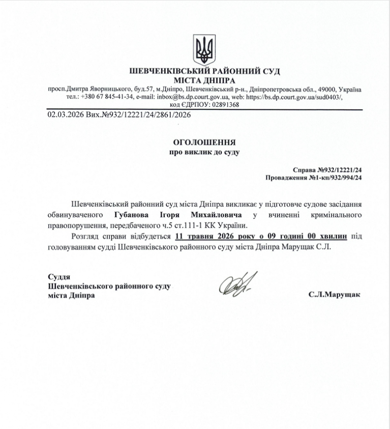 Оголошення про виклик Губанова І.М.