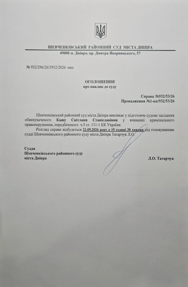 Оголошення про виклик до суду Кашу Світлани Станіславівни
